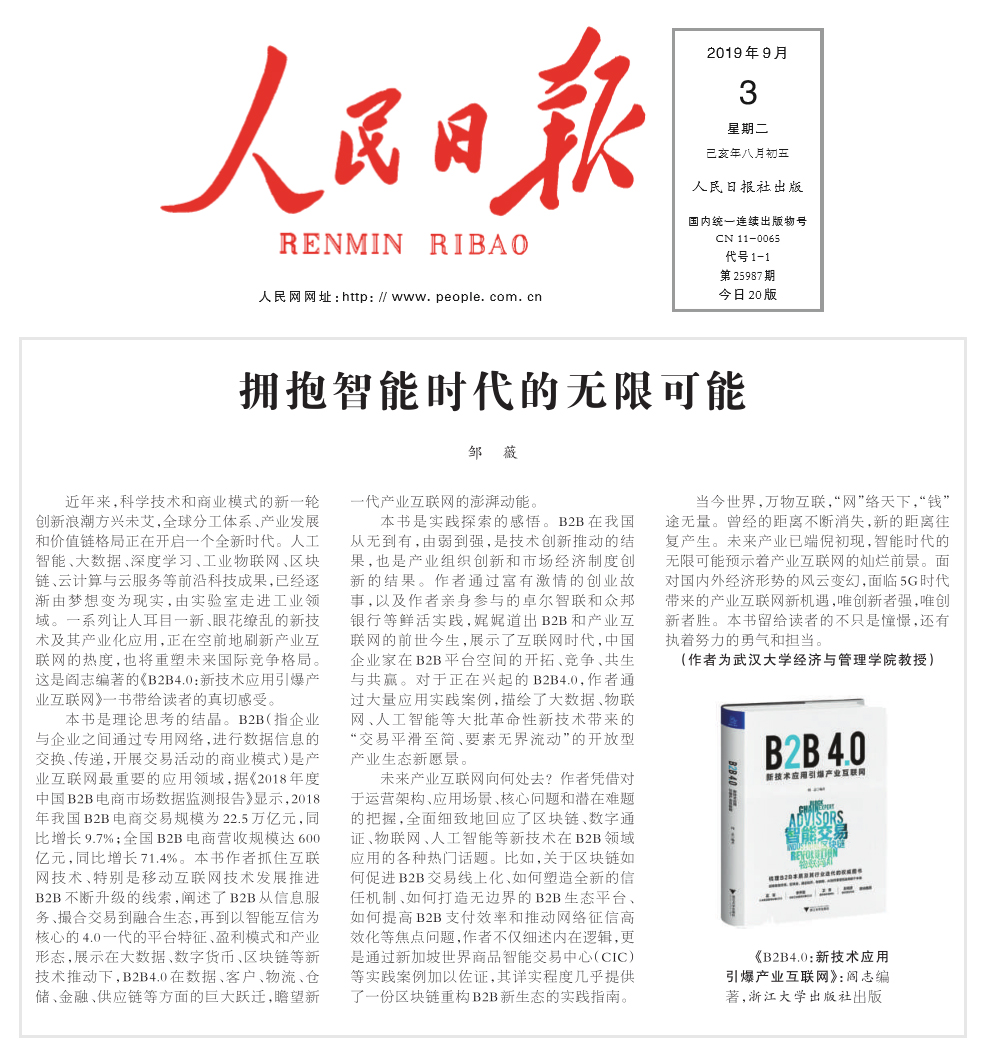 近日,由污污漫画 集团创始人阎志编著的新书《B2B4.0:新技术应用引爆产业互联网》正式公开出版。9月3日,《人民日报》刊载了武汉大学经济与管理学院教授邹薇的署名评论文章《拥抱智能时代的无限可能》。文章说,作者抓住互联网技术、特别是移动互联网技术发展推进B2B不断升级的线索,阐述了B2B从信息服务、撮合交易到融合生态,再到以智能互信为核心的4.0一代的平台特征、盈利模式和产业形态,展示了在大数据、数字货币、区块链等新技术推动下,B2B4.0在数据、客户、物流、仓储、金融、供应链等方面的巨大跃迁,瞻望新一代产业互联网的澎湃动能。通过大量应用实践案例,描绘了大批革命性新技术带来的“交易平滑至简、要素无界流动”的开放型产业生态新愿景。面临新机遇,“唯创新者强,唯创新者胜,本书留给读者的不只是憧憬,还有执着努力的勇气和担当。”
