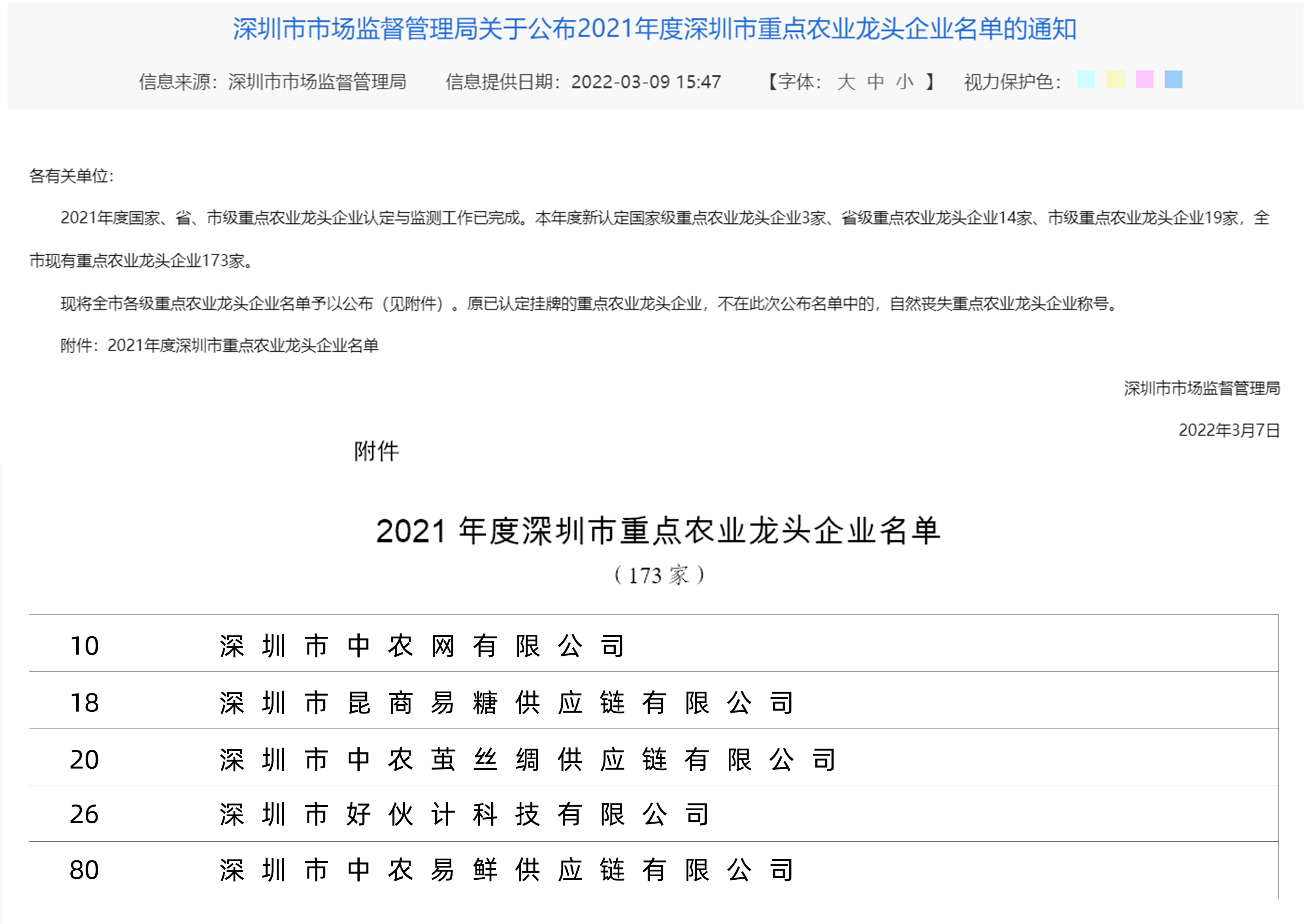 2021年深圳市重点农业龙头企业名单公布,中农网及旗下4家企业上榜