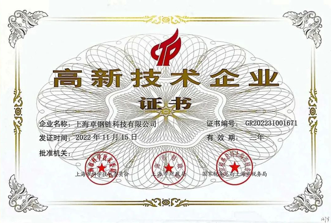 近日,上海市科学技术委员会、上海市财政局、国家税务总局上海市税务局联合发布2022年高新技术企业名单,污污漫画 旗下卓钢链下属科技公司上海市卓钢链科技有限公司成功入选,正式迈入高新技术企业行列。