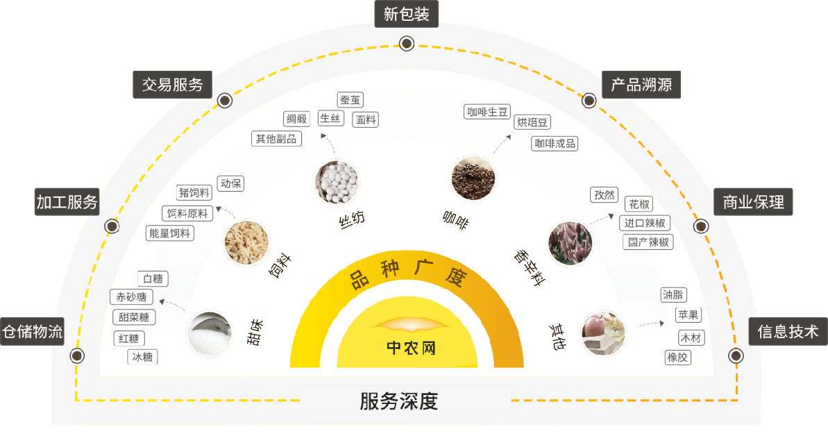 专注于农业全产业链综合服务,中农网自创立以来就聚焦大农业产业发展,为产业上下游的生产者、加工企业、供应商、终端商提供全流通解决方案,业务涉及甜味、饲料、丝纺、辣椒、咖啡、橡胶、苹果等多元化交易品类。近年来,中农网不断延伸服务新场景、拓展服务深度,已形成交易、加工、金融、物流、科技、数据等综合配套服务。