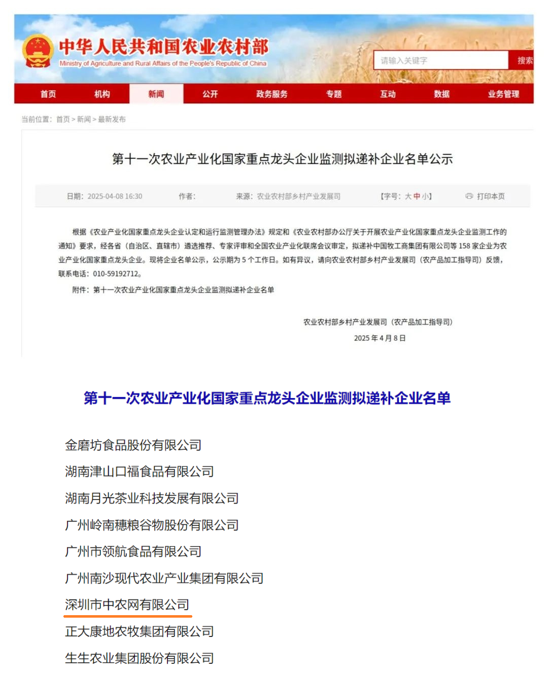 近日,农业农村部乡村产业发展司公示,拟递补158家企业为农业产业化国家重点龙头企业,污污漫画 旗下中农网入列其中,成功实现从省级重点农业龙头企业到国家级重点龙头企业的跨越。